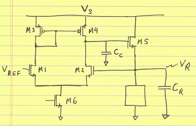 This consideration on the drains of M3/M4 indicates a limitation: if the quantity VR + |VGS5| is too close (or higher than) VS, we cannot design a regulator using this topology. For example, if VS is 2.5 V and VR is 1.8 V, and a threshold is 700 mV, we don’t have enough headroom because VR + VT5 will be 2.5 V. The drain voltage of M4 (VR + VT5 + VDSAT5) will be higher than VS (2.5 V).